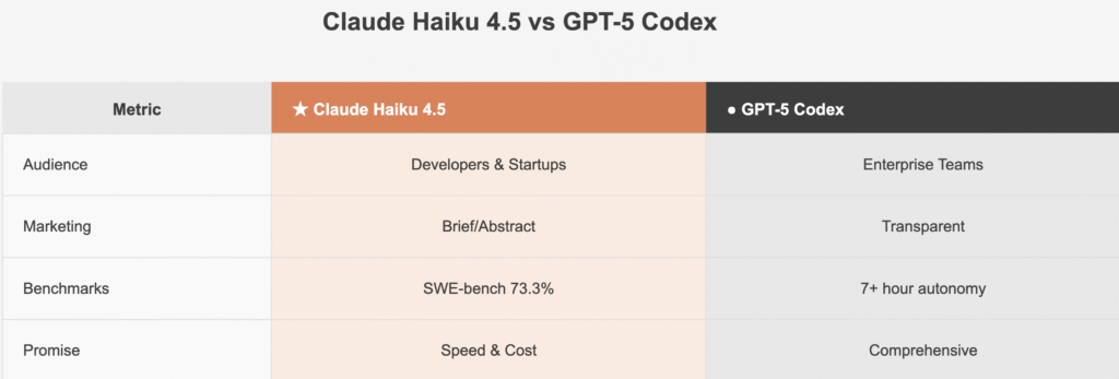 Visual comparison of Anthropic Claude Haiku 4.5 minimalist branding and OpenAI GPT-5 Codex demonstration showing contrasting developer marketing approaches through interface screenshots, collaboration scenes, and terminal icons