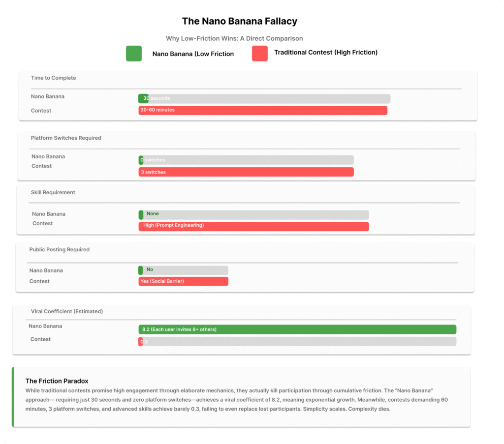 Lesson isn’t “AI contests don’t work.” It’s “understand your users’ tolerance for friction, and design accordingly.” Nano Banana succeeded because it asked for 30 seconds. This contest asks for 30 minutes plus public vulnerability. That’s the difference between viral growth and expensive theatre.