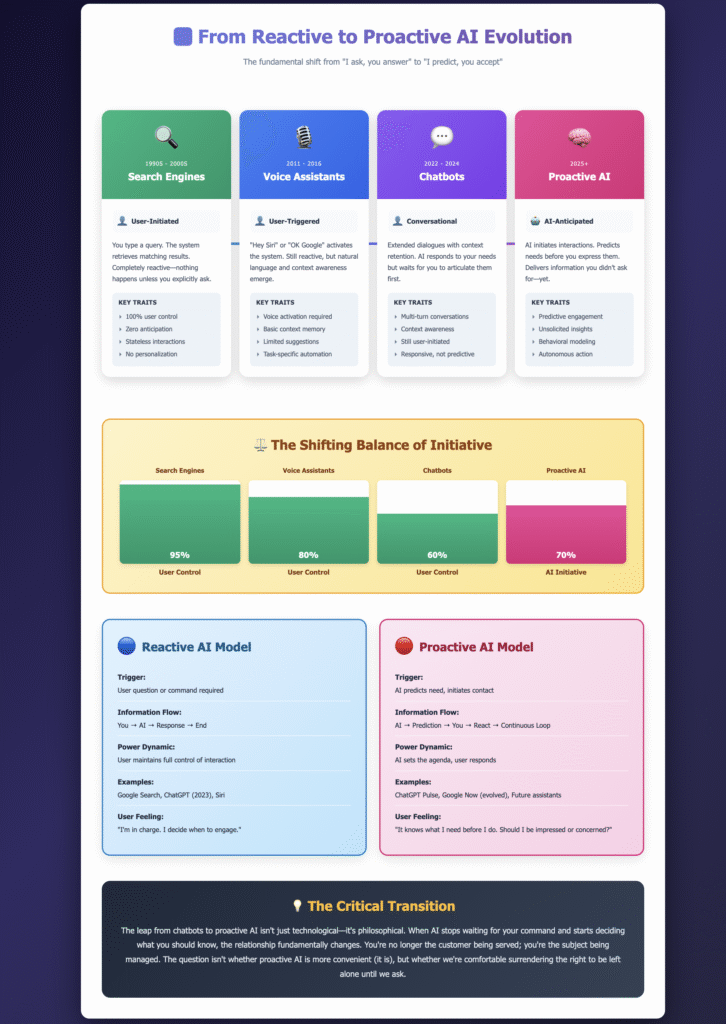 “The leap from chatbots to proactive AI isn’t just technological—it’s philosophical. When AI stops waiting for your command and starts deciding what you should know, the relationship fundamentally changes.”