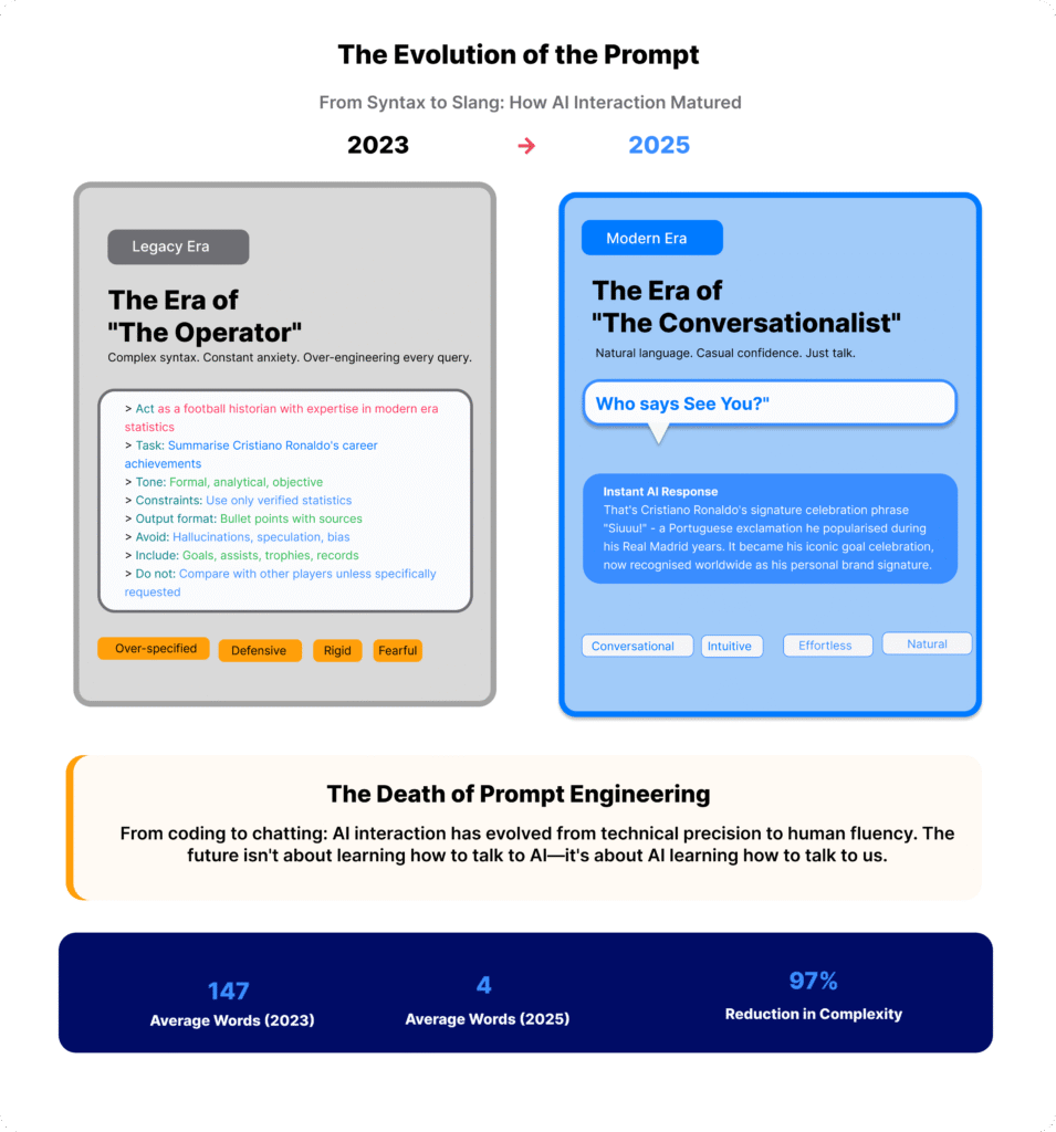 Early AI marketing (2023-2024) was obsessed with “Prompt Engineering.” We were told we had to learn a new syntax, a magical code to get the machine to work. It was intimidating. It felt like coding.